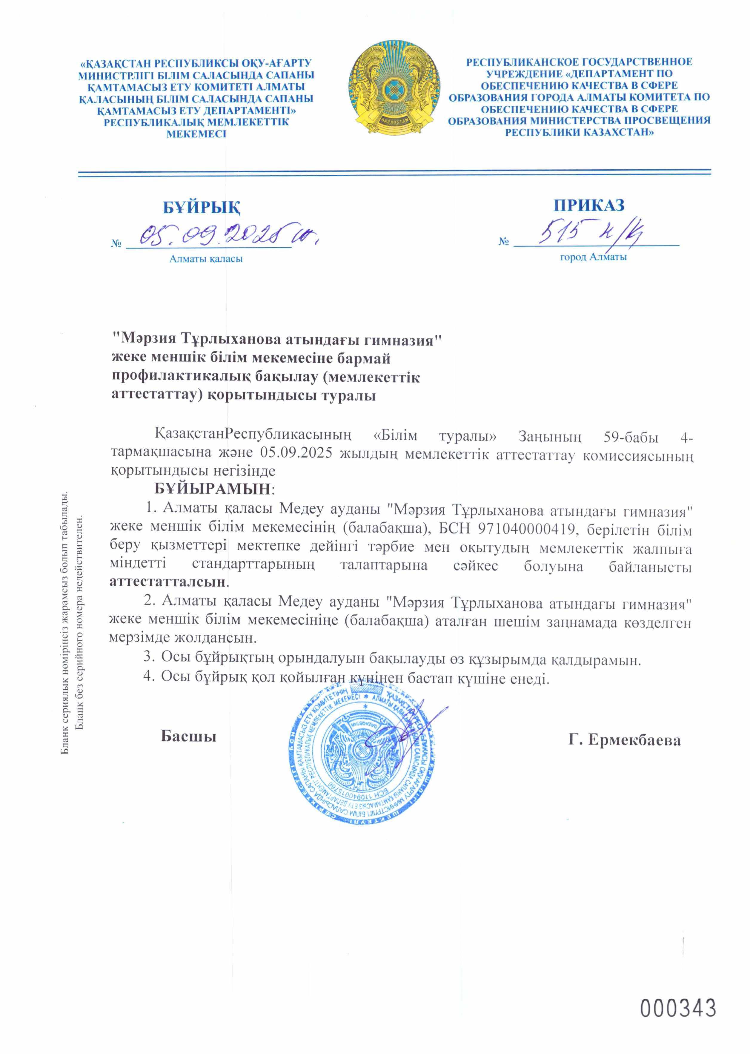 Балабақшаның аттестаттаудан өту туралы бұйрық (Приказ о прохождении аттестации детского сада)